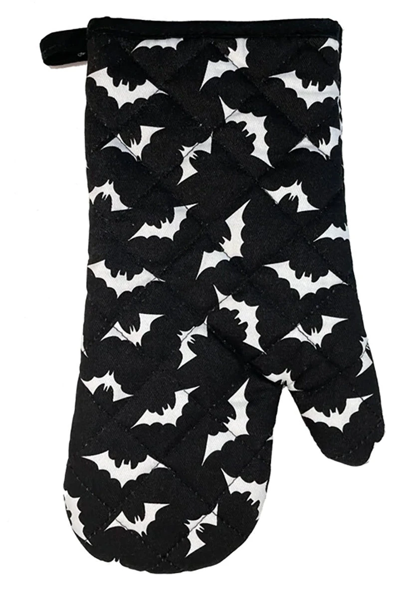 Protect your creepy cooking hands with this batty pot holder, designed to summon spooks in your kitchen! Constructed of quality cotton, this goth oven mitt features an all-over black and white bat print. Complete with a hanging loop for easy storage!